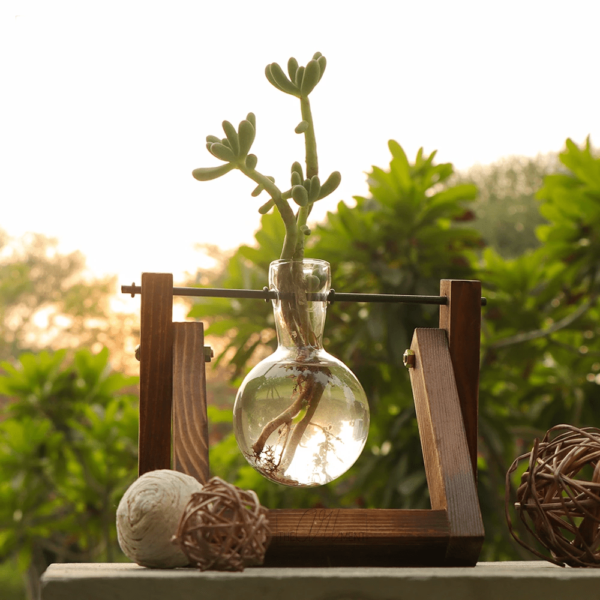Round bottom flasks hanging on a wooden tray, perfect for those science enthusiasts! Our flask planters have a Minimal style using organic materials and a touch of modernity are perfect decor pieces for all spaces- indoor or outdoor. nThe ideal decor piece to be kept on your side table, balconies, or even study tables, these flask planters bring a sense of style and calmness together.